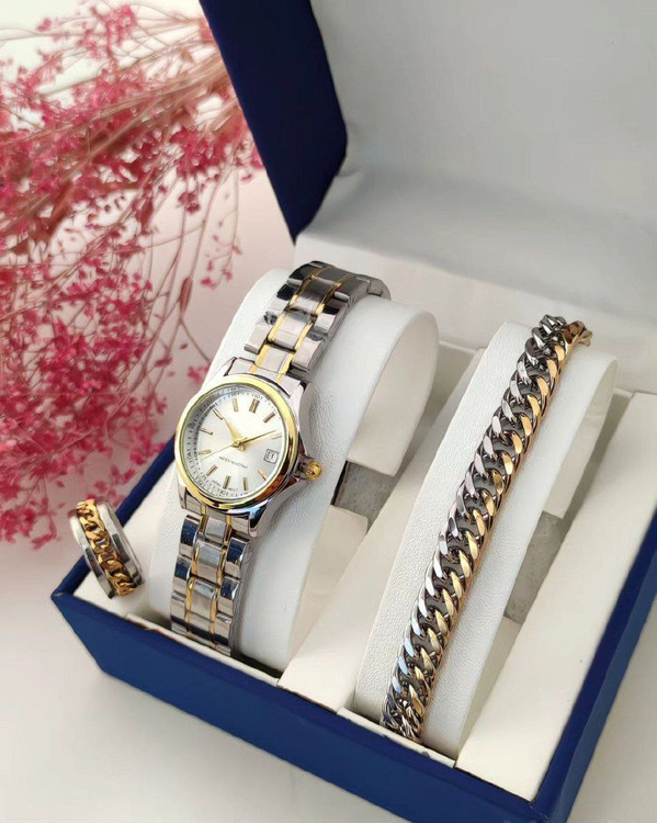 پک زنانه ی ساعت، دستبند و حلقه میتواند یکی از مناسب ترین کادو ها برای مناسبت های مختلف باشد. ساعت از برند Casio بوده و دارای ۶ ماه گارانتی موتور میباشد. ساعت دارای تقویم بوده و از کیفیت بالایی برخوردار است جنس ساعت، دستبند و حلقه از استیل رنگ ثابت بوده و بسیار با کیفیت است. این کار حالت دو رنگ داشته و به رنگ نقره ای طلایی موجود است.
